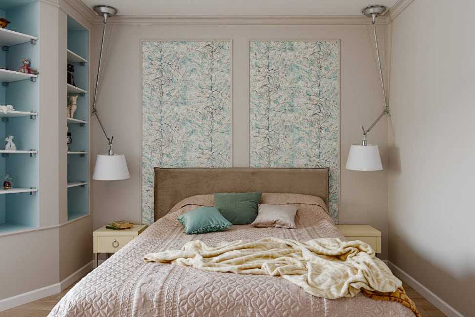 Чтобы сэкономить место прикроватные тумбочки можно заменить полкой, расположенной над изголовьем кровати или между кроватью и стеной.