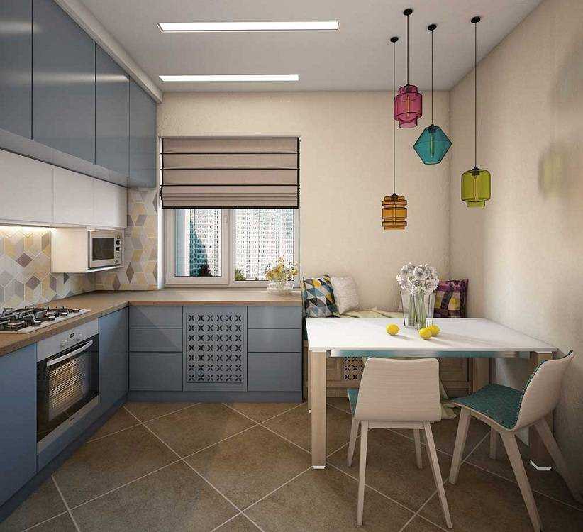 Размещать рабочую поверхность желательно вдоль короткой стены, а обеденный стол возле окна.
