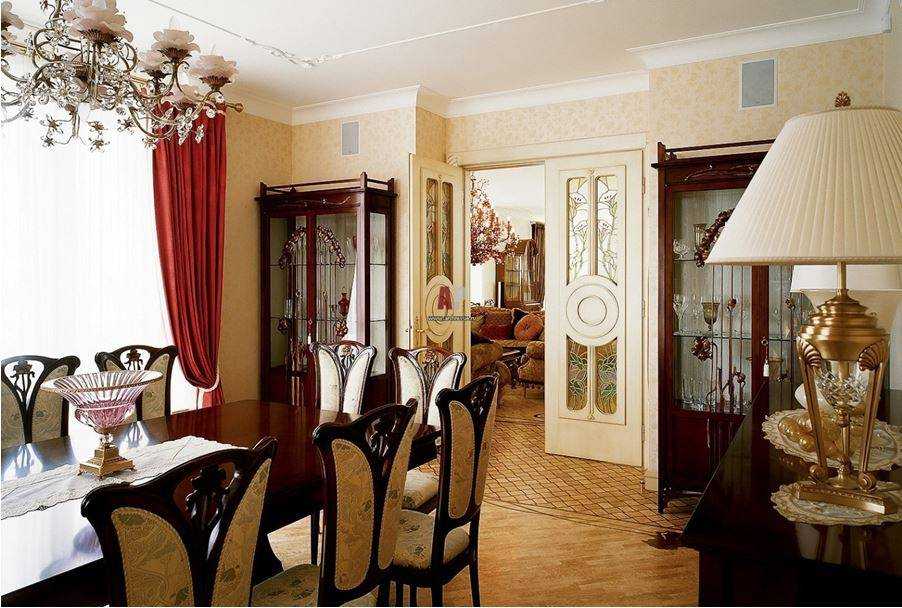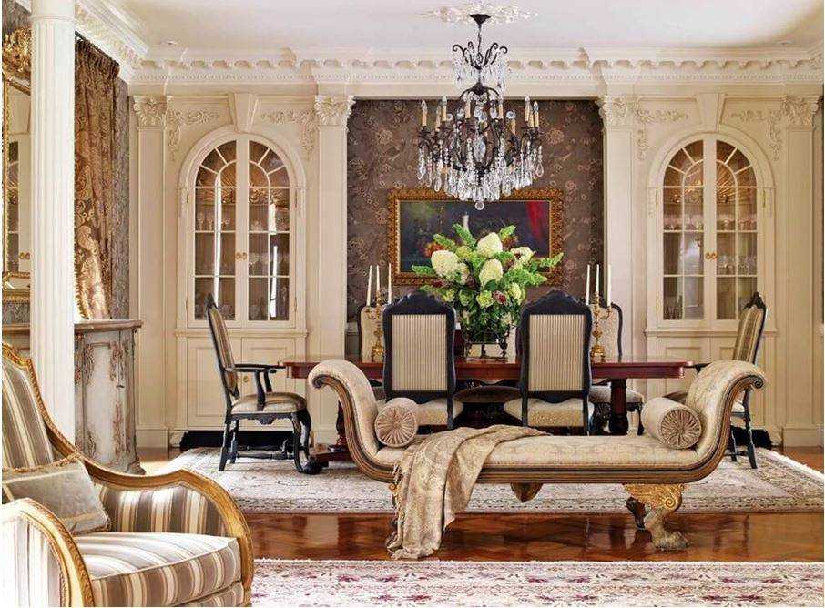 Классицизм выдают лепные элементы, стулья с высокими спинками, хрустальные аксессуары, арочные конструкции, шторы с ламбрекеном.