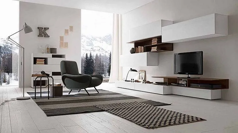 Центром комнаты должна стать необъемная низкая подставка под телевизор, при этом сам телевизор лучше закрепить на стене. По углам комнаты можно расположить комоды, а цвет подобрать темнее на тон-два, чем подставка для телевизора, это позволит визуально расширить комнату.