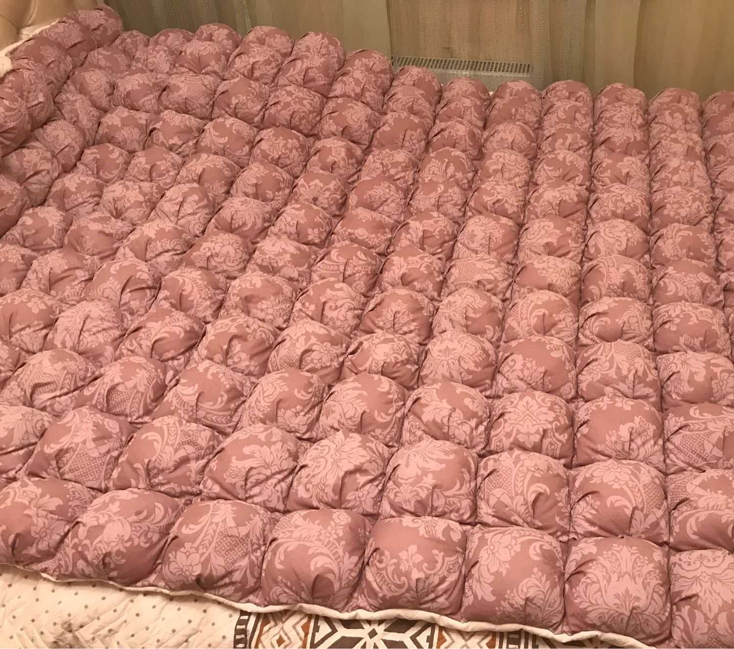 Это одеяло, у которого есть две стороны: объемная «пузырчатая» лицевая и плоская изнанка. «Пузыри» — это обшитые тканью наполнители из синтепона или холлофайбера. Они расположены на плотном полотне-основе. Им можно придать объем посильнее (как у пуфика, «зефирное» одеяло) или сделать в виде уплощенных квадратов.