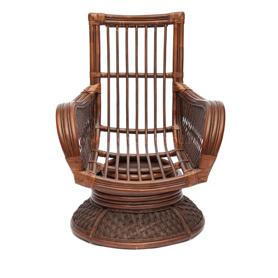 Еще одним популярным креслом-качалкой является модель Papasun Swivel Rocker МИ с габаритами 115х98х97 см. Оно сплетено из натурального ротанга и отличается повышенной прочностью. Конструкция представляет собой полусферу, размещенную под углом 45º на пружинном основании. Последнее имеет два диаметра, где блок для качания сужен, что повышает безопасность — попасть туда ногой или пальцами просто невозможно. Круглая основа с увеличенным диаметром делает кресло очень устойчивым при разной амплитуде движений. Качаться в нем можно в любом направлении и такие действия, судя по отзывам, полностью беззвучны. Комплектуется модель круглой подушкой со слоем наполнителя 200 мм.