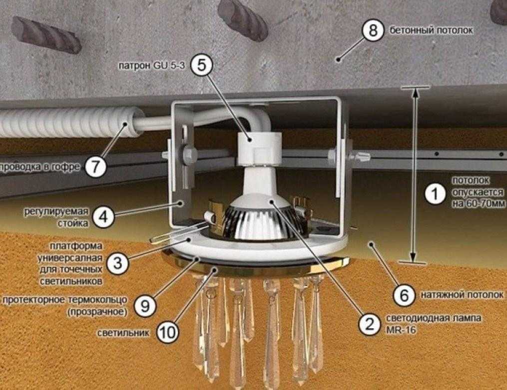 Здесь самое главное, чтобы натяжной потолок скрывал провода. Их лучше продеть сквозь гофрированный пластмассовый шланг. Соединения крепко скручивают или пропаивают. Оголенные участки закрывают кембриком. Все это крепится специальными зажимами к перекрытию, чтобы проводка не касалась пленки в натянутом состоянии. В принципе, достаточно зазора, который формирует профиль, удерживающий полотно натяжного потолка. Иное дело, если светильник встроенный.