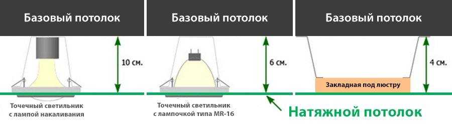 Светильник не прикручивают намертво к базовому потолку. Необходимо специальное крепление, похожее на то, которым пользуются при сборке гипсокартонных конструкций. При этом уже теряется 1-3 см. Дальше в расчет закладывают глубину патрона светильника, если он встроенный. В противном случае используется закладная, что также повлияет на расстояние от полотна до натянутой пленки. Элементы декора могут сделать так, что комната будет казаться ниже, но при этом шире. Поэтому нужно учитывать все аспекты.