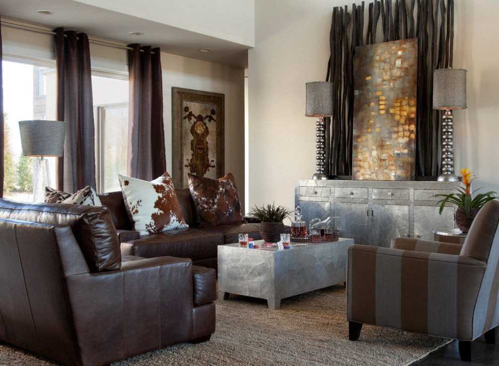 Использование коричневого дивана в разных стилях интерьера комнаты