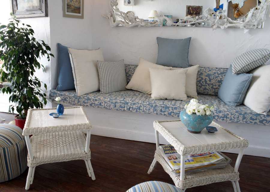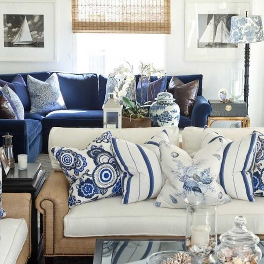 Отличным выбором станет флотский цвет. Но им следует выделить что-то одно – стену, пол, мебель или потолок. Аксессуары подбираются в тон. Если в гостиной установлен синий диван, то все остальное должно быть в светлых оттенках.