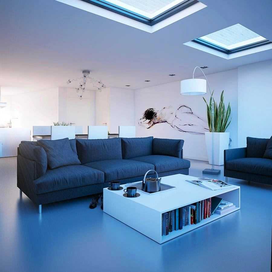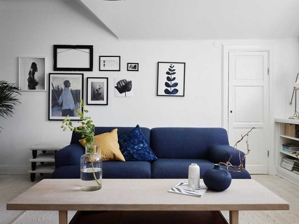 Синий диван в интерьере гостиной отлично сочетается с различными стилями
