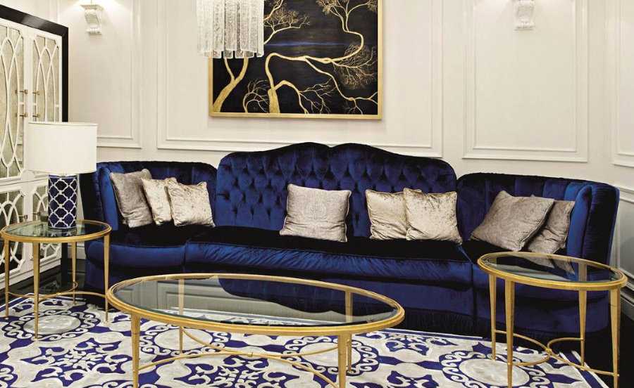 - Ультрамариновый. Мягкую мебель ярких оттенков синего лучше размещать в комнатах с нейтральной отделкой стен и пола. Дополняющие цвета — бежевый, желтый, золотой, коралловый.