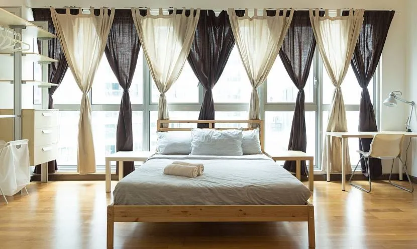Количество света в спальне можно регулировать при помощи жалюзи и штор.