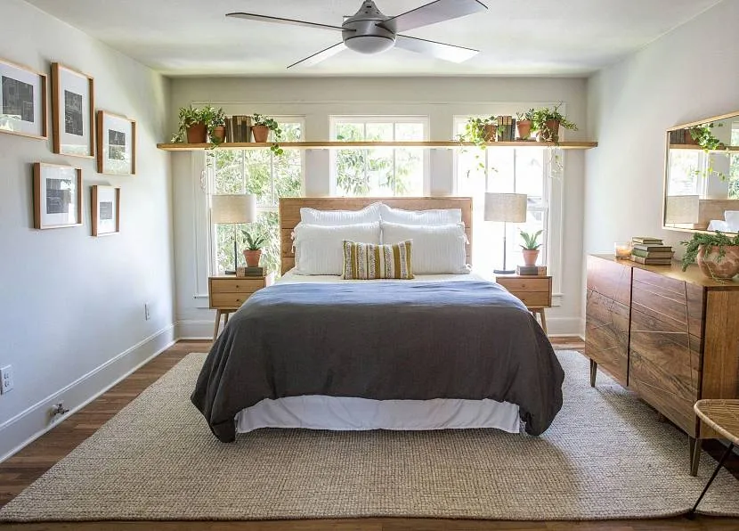 Начнем с плюсов и также перечислим ситуации и планировки, когда кровать спинкой у окна — это стильное и рациональное решение.