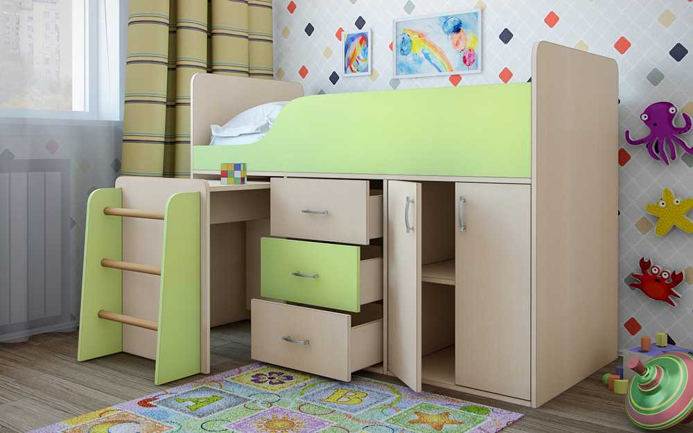 Специально для организации рабочего пространства ученика или студента разработана модель, в которой кровать совмещена со столом. Они взаимозаменяют друг друга в зависимости от необходимости.
