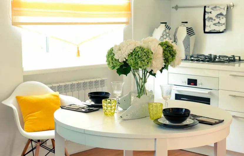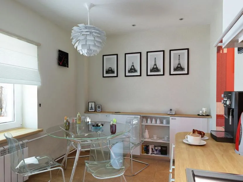 Более того, светлый гарнитур на светлом фоне может стать неудачным решением, если не получится создать перспективу. Чтобы избежать ошибки, рекомендуется подбирать не один, а несколько светлых или пастельных оттенков; так интерьер будет восприниматься более сложным и интересным. Создать объем в маленьком помещении помогут цветовые акценты – текстиль, посуда, декор, люстра.