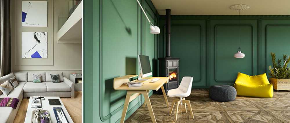 Благодаря молдингам получается сделать стильный акцент на стене и привнести в обстановку определенного ритма.
