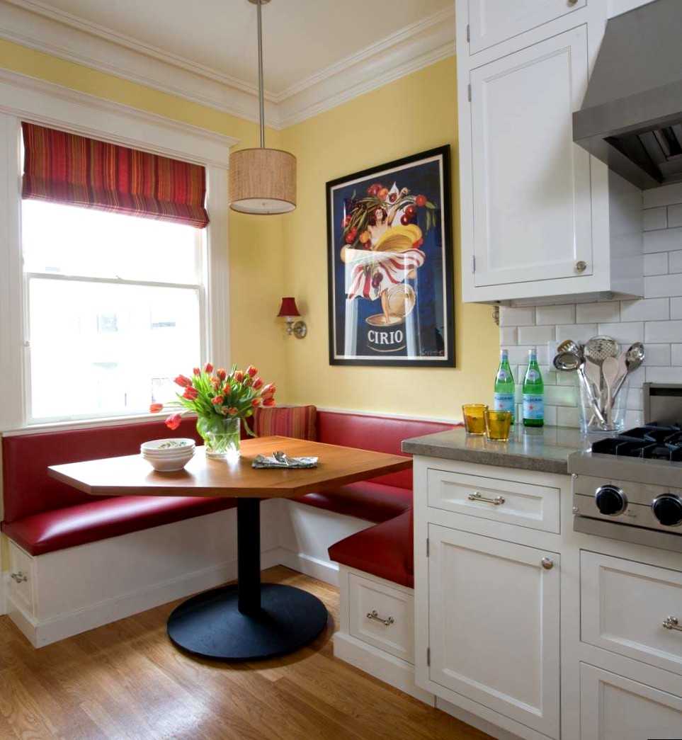 Небольшие кухоньки обустраивают угловой мебелью. Так значительно экономиться место. В одном углу ближе к двери располагают гарнитур, а в противоположном диван-уголок и стол.