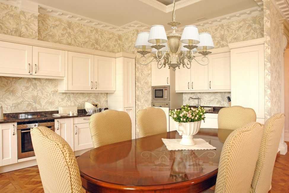 Вы любите свою кухню и часто в ней находитесь? Если это помещение предназначено не только для приготовления пищи, но и для неспешного чаепития и чтения книг, подберите какой-либо нейтральный тон обоев. Спокойная расцветка с неярким мелким принтом станет не только украшением помещения, но и создаст атмосферу уюта и спокойствия.
