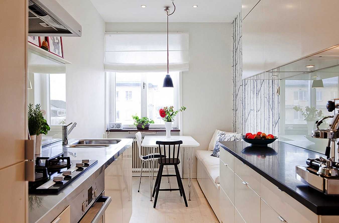 Узкое пространство проще всего организовать при помощи линейной расстановки. Вдоль одной стены — мебель, а напротив бытовые приборы. В конце комнаты можно организовать стол, правда поместятся там максимум два человека.