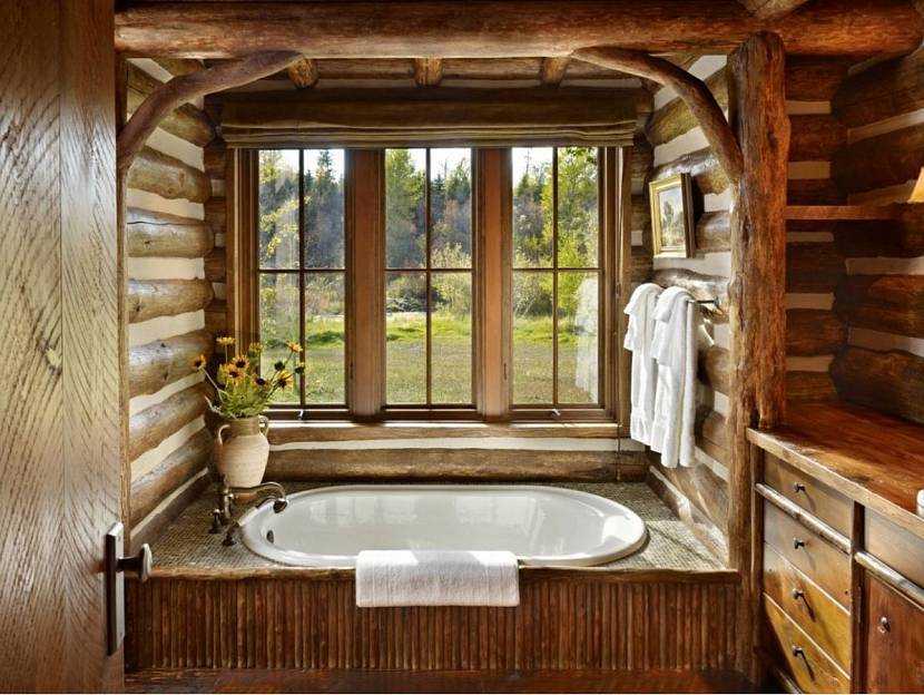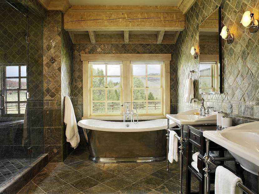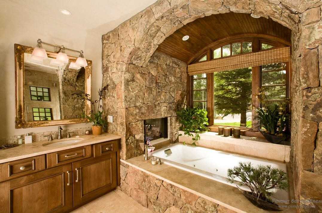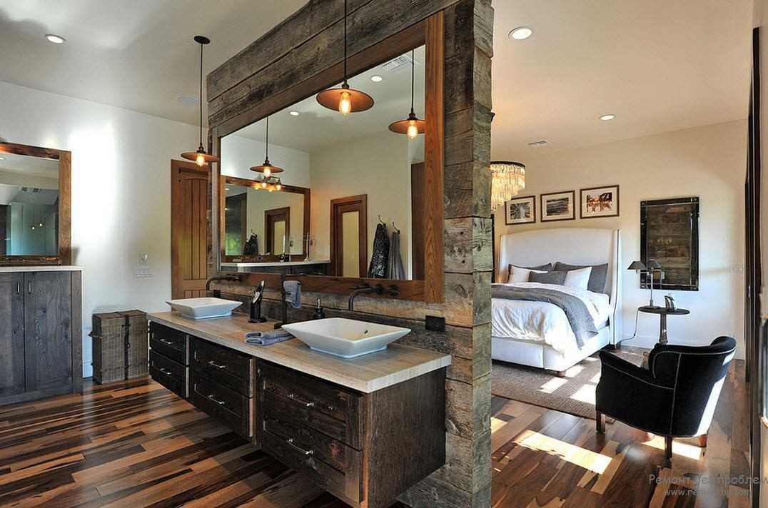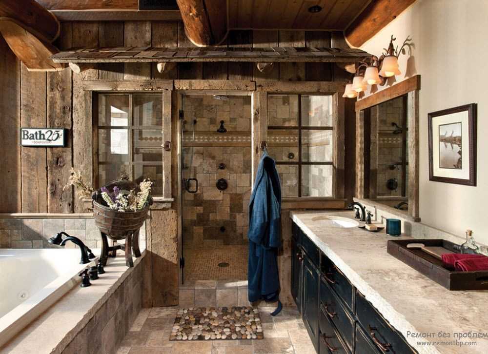 В ванной альтернативой натуральной древесине станет керамика под камень. Деревянную раму на зеркале стоит заменить резиновой или пластиковой имитацией. Стиль рустик в интерьере санузла визуально скрадывает квадраты, поэтому лучше не использовать темные цвета в отделке.