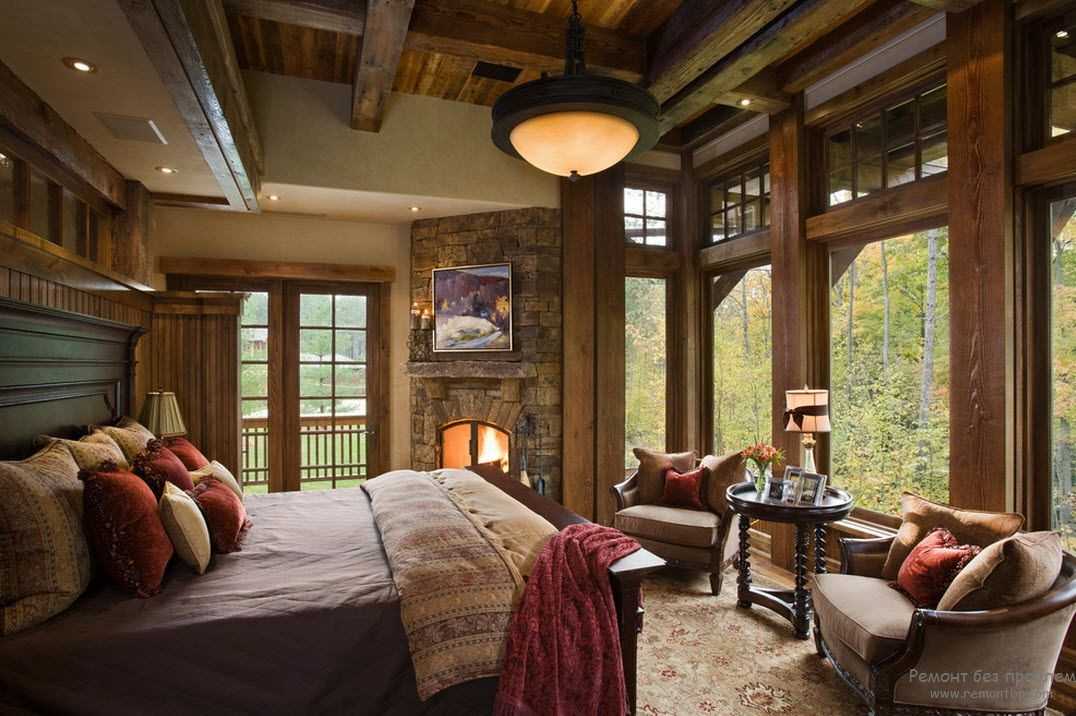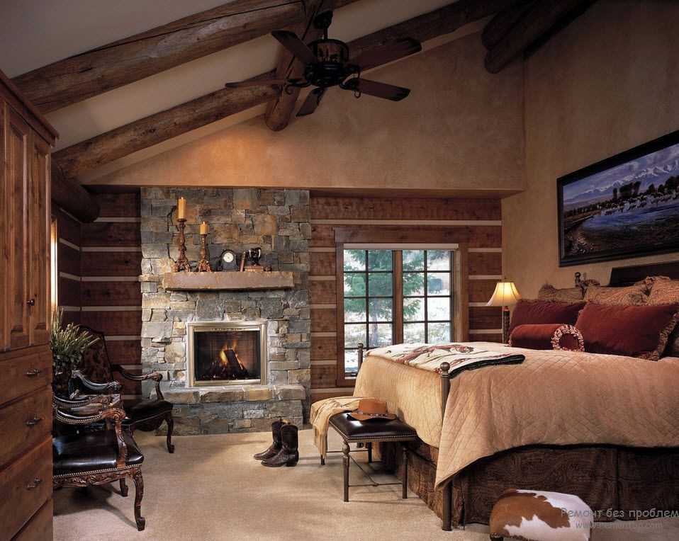 Стиль рустик в интерьере легко узнать по габаритной кровати в центре комнаты. Ложе выполняют из бревен или устанавливают матрас на грубо сколоченные ящики. Изголовье украшают панно из спилов или используют кованую «решетку». Парные тумбы по цвету гармонируют с остовом постели. На столешницах – светильники с винтажными абажурами или в форме подсвечников.