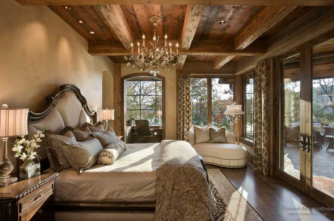 В стиле рустик применяют много древесины. Для отделки стен подходит как мореный дуб, так и элегантная вишня. При минимальной обработке сырья на поверхности оставляют мелкие трещины, сучки. Если дерево используют в детской или спальне, то материал зашкуривают, покрывают морилкой. Массивные балки на потолке выглядят потемневшими от времени.
