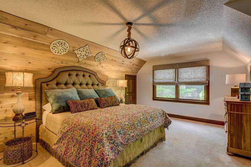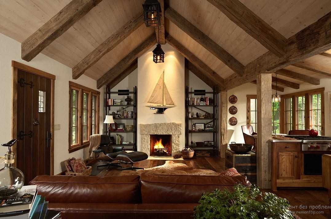При оформлении помещения в загородном доме потолок максимально открывают и украшают балками. В ограниченном пространстве дизайнеры рекомендуют участок побелить или использовать панели под светлое дерево. Комната должна чувствуется большой и просторной.