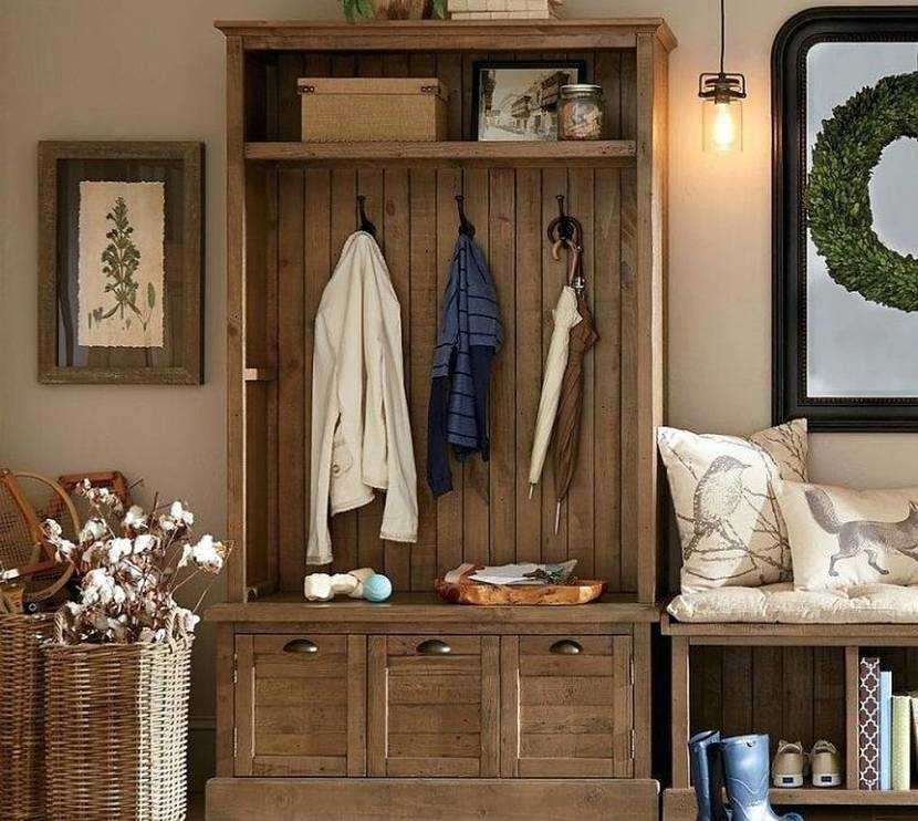 Стиль рустик в интерьере прихожей проявляется в сочетании разных поверхностей. Небольшое помещение оформляют в светлых пастельных оттенках. На полу – кафель под камень или доски ламината. Входная дверь обязательно с массивной фурнитурой под старину. На стену монтируют вешалку с корягами, ковкой или рогами оленя.