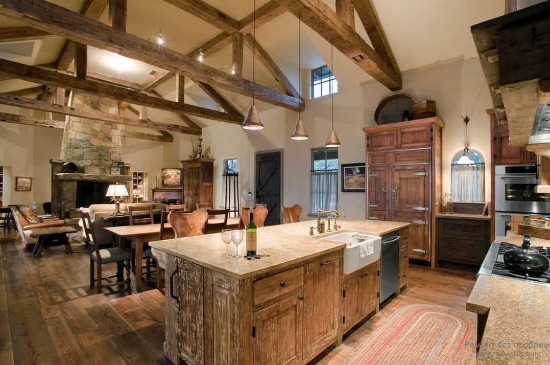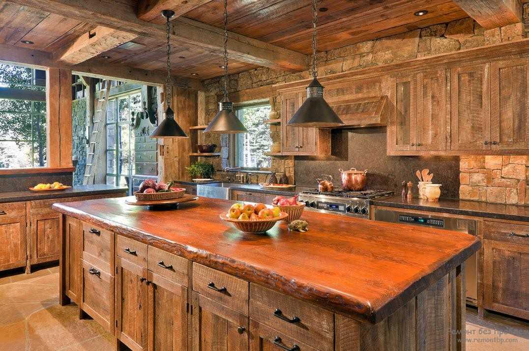 Фартук в рабочей зоне облицовывают под природный материал (камень, дерево, мозаику). Добавить интерьеру колорита стиля рустик помогут светильники, напоминающие факелы или подсвечники. В центре потолка на балке – огромная люстра, которая перекликается с дизайном осветительных приборов.
