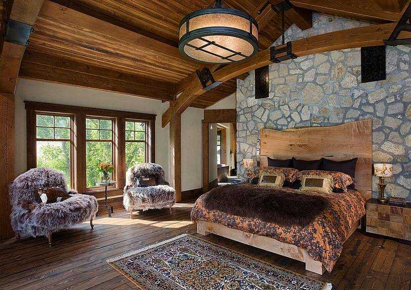 На первый взгляд помещение с рустикальным дизайном напоминает пещеру первобытного человека, логово волка-одиночки или заброшенный домик в горах. Но, если присмотреться, то можно увидеть комфортные условия для жизни и приятного времяпровождения. В силу того, что для создания такого интерьера необходимо много камня и дерева, его чаще всего применяют в загородных домах, но при желании рустикальный уголок можно создать и в городской квартире. Для этого можно использовать не слишком массивные деревянные балки на потолке, а заменить их искусственно состаренным массивом дерева. На стены и пол уложить каменную плитку, пластиковую балконную раму (при наличии) можно демонтировать и вместо нее создать укромный уголок с деревянной лавкой.