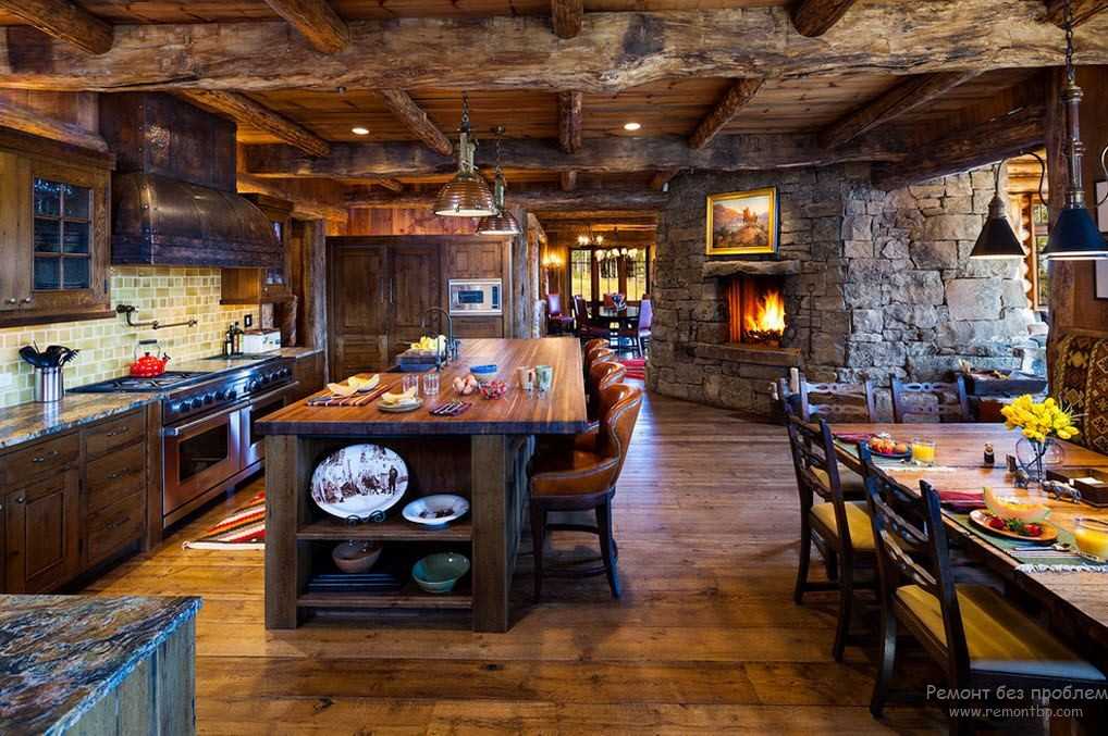 Комната должна быть удобной, функциональной и простой. Стулья располагают вокруг стола (барной стойки) с декоративной столешницей из спила толстого дерева или куска камня. Бытовые приборы прячут под мебельными фасадами. Вытяжную трубу или водонагреватель можно обустроить под элементы русской печи.