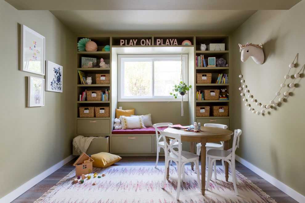 В данной комнате, конструкция, установленная рядом с оконной зоной, предоставляет максимально эффективное размещение игрушек, принадлежностей для занятий и других вещей. При оборудовании шкафчиков в первую очередь учитывают возраст и рост ребенка, для того, чтобы он имел свободный доступ ко всем ящиками и полкам, а также критерии безопасности, которые предполагают отсутствие острых углов.