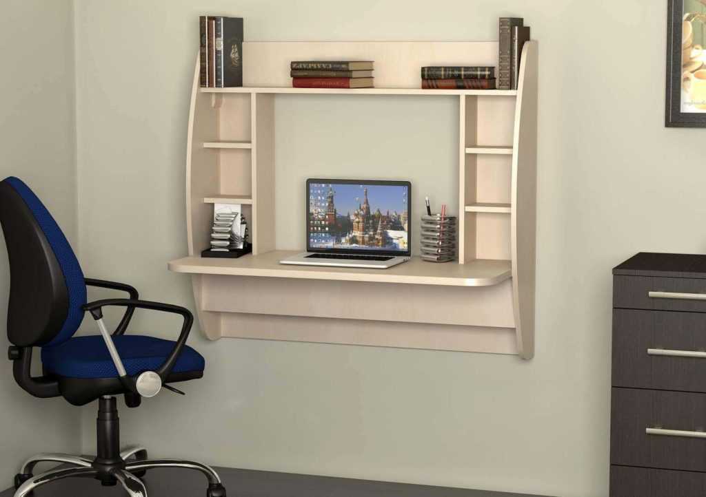 Технически стол выглядит, как полка, которая имеет определенные размеры. Крепеж похож на установку обычной полки. Иногда предлагаются откидные варианты, в этом случае столик имеет петли, он просто опускается на время работы. В остальное время столешница поднята. Такой вариант подойдет для людей, которые редко пользуются ноутбуком дома. Также откидной столик позволит значительно сэкономить пространство комнаты.