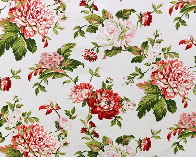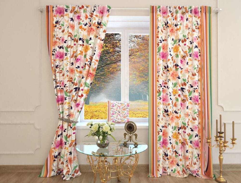 кремово-белые занавески с россыпью красно-желтых цветочков по всей поверхности;