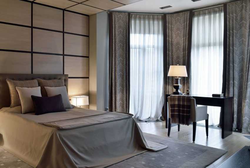 Графитовые полупрозрачные шторы на всю стену в классической спальне