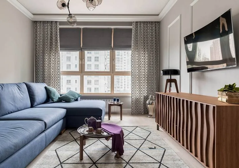 Удачным вариантом признаётся использование современных римских или рулонных конструкций. Панели выбирают строго по параметрам створок. В небольшой комнате удачно будут смотреться легкие занавеси. С короткими шторами надо быть осторожнее. Они рискуют добавить интерьеру пустоту и провинциальность.
