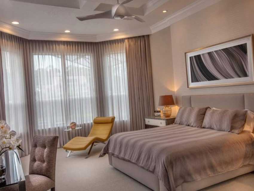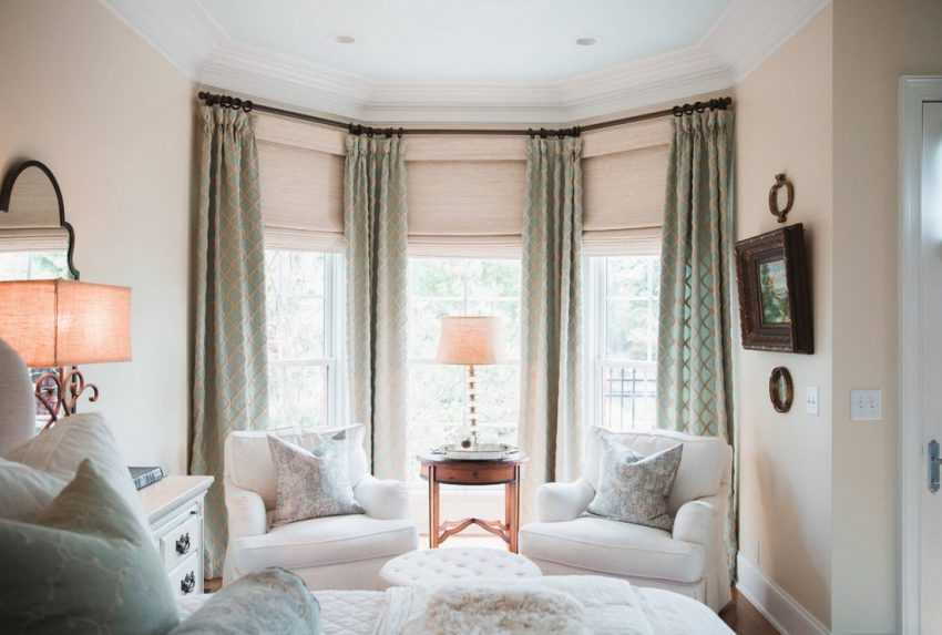 Оформить шторами эркерные окна спальни кажется сложной задачей. Обязательно создают целостную композицию, соответствующую интерьеру. Такие окна обычно пропускают достаточно света, что упрощает выбор текстиля. Здесь уместны шторы в классическом понимании. Пышное оформление смотрится величественно и колоритно.