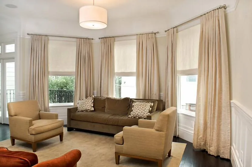 Комбинированные шторы двух цветов – короткие поверх длинных, раздвижные и римские, шторы-нити и ролеты – еще один способ сочетания тканей.