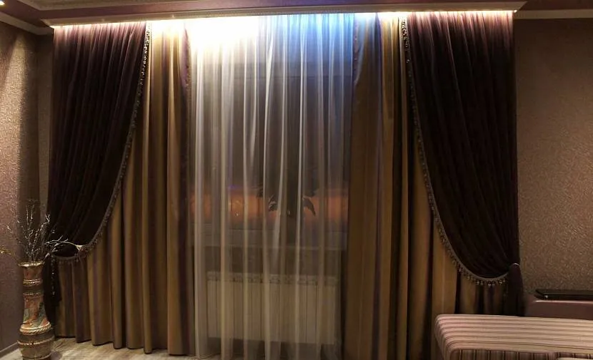 Чем выше потолки в помещении, тем более длинные шторы можно использовать.