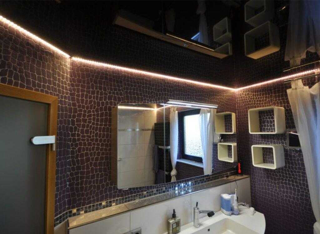 Это помещение с экстремальными условиями – на стенах и потолке может скапливаться много влаги, копоти, жировых капель. Лучшим решением будет конструкция из ПВХ, в частности, глянцевая. Хорошо использовать такое полотно при отделке маленьких кухонных зон. Глянец зрительно увеличивает комнату, что становится важным преимуществом.