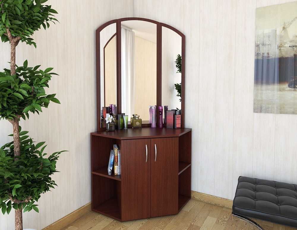 Самыми удобными принято считать большие трюмо с зеркалом, площадь которого больше столешницы. Оно визуально увеличивает пространство, но для маленьких комнат лучше выбирать другие модели.