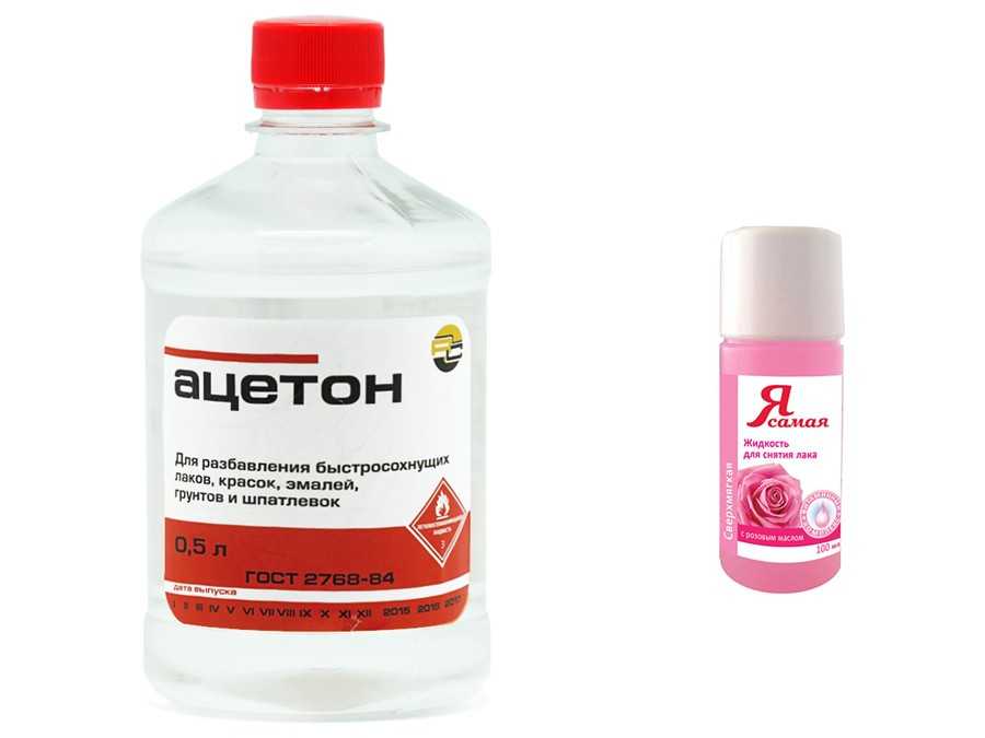 Ацетоносодержащие средства, например, жидкость для снятия лака с ногтей, или ацетон. Агрессивный состав ацетона позволяет эффективно удалять свежие загрязнения, с застывшими пятнами могут возникнуть трудности, потребуется воздействие на протяжении 15-30 минут. Ацетон подходит не для всех поверхностей