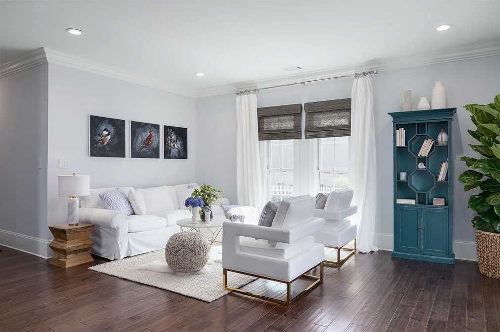 Плинтус необязательно должен сливаться с полами. Если стены светлые, а потолок белый, плинтус тоже может быть белым. Кроме того, он может соответствовать цвету стен или дверей.