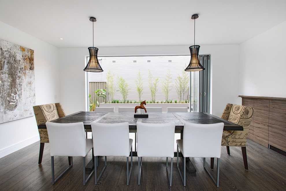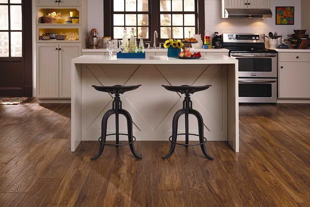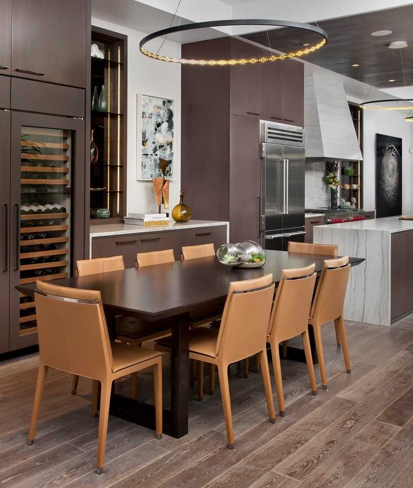 В кухне это может быть ламинат с имитацией натурального дерева теплого коричневого цвета, перекликающийся со столом, стульями и полом в похожем оттенке. Добавьте непринужденности подвесными лампочками над столом и оригинальным плакатом.