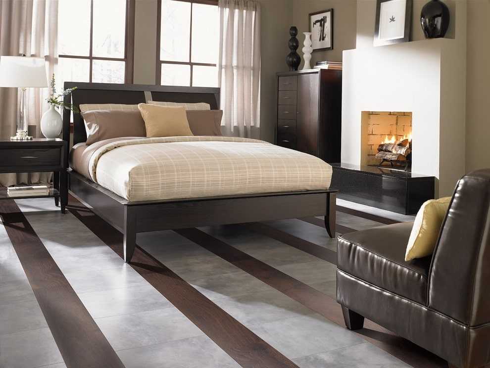 Спальня в стиле минимализм с темным ламинатомИсточник pol-master.com