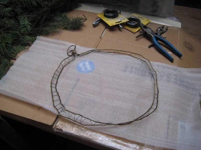 Если в доме найдется резина от старого велосипедного колеса, то ее можно использовать как основу для большого новогоднего венка. Половину шины оборачиваем куском мешковины, другую декорируем искусственными еловыми ветками. Украшаем венок елочными игрушками и другим новогодним декором.