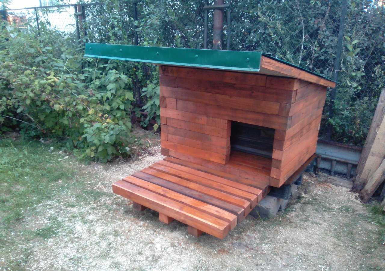 - Последний этап — кровля крыши шиферными листами. Финишная отделка антисептическим средством и установка на поддон завершают изготовление будки для маленького любимца.