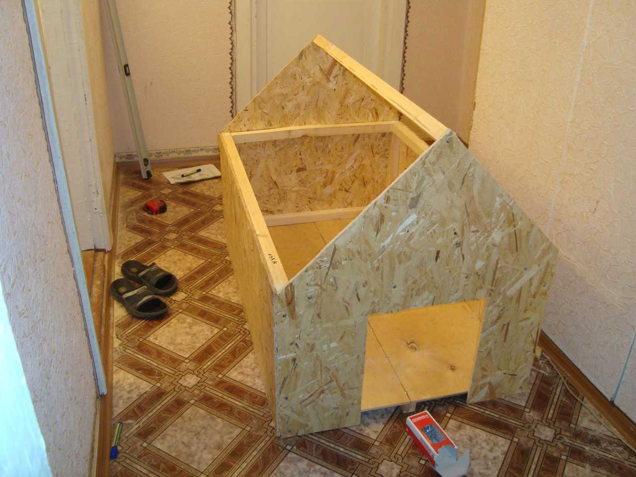 Многие четвероногие друзья имеют привычку забираться на свое жилище. Для таких питомцев лучше подготовить дом с плоской крышей. Чтобы ее соорудить, потребуются брусочки 4х4 см. Из них изготавливают раму (она должна соответствовать периметру домика) и сверху прибивают квадратный кусок, вырезанный из ДСП.