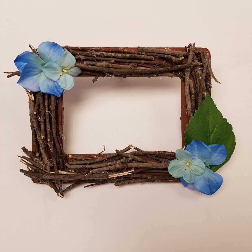 Очень интересным элементом декора могут стать сухие веточки, которые многие считают обыкновенным хламом. Разные размеры и структура палочек сделают каждую рамку уникальной.