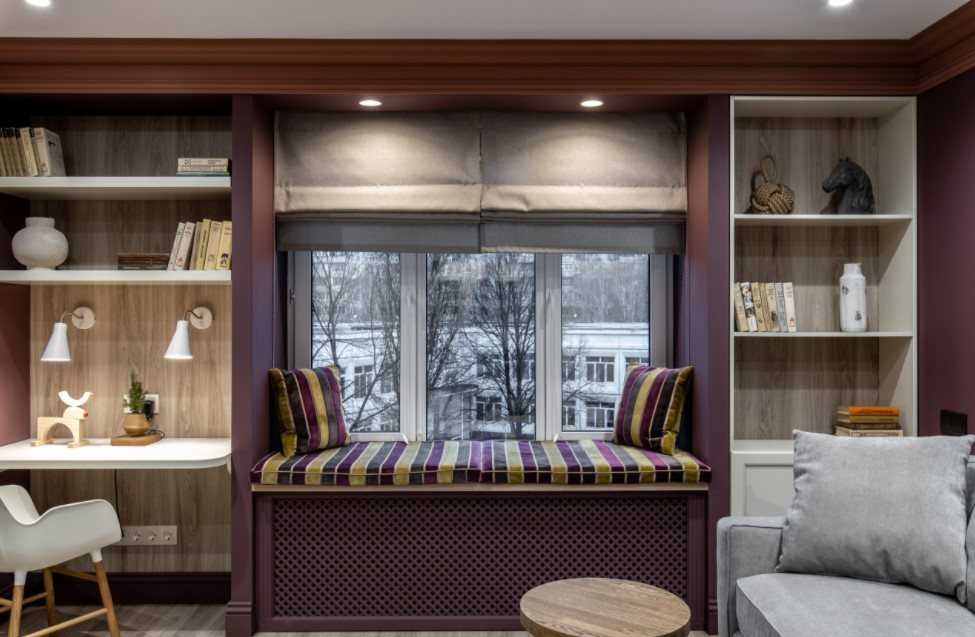 А вот если у вас дерево фиолетовое или с зеленоватым отливом, оно хорошо будет смотреться с серым, сиреневым, малиновым и синим.