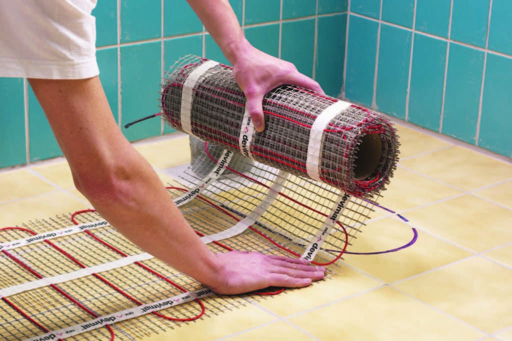 - тепловые маты – разновидность кабельной системы. Кабель закреплен на стекловолоконной сеточке, что облегчает процесс укладки. По поверхности просто раскатывается рулон, все заливается тонким слоем стяжки, устраивается покрытие. При необходимости во время монтажа сетку можно надрезать и развернуть в нужную сторону,