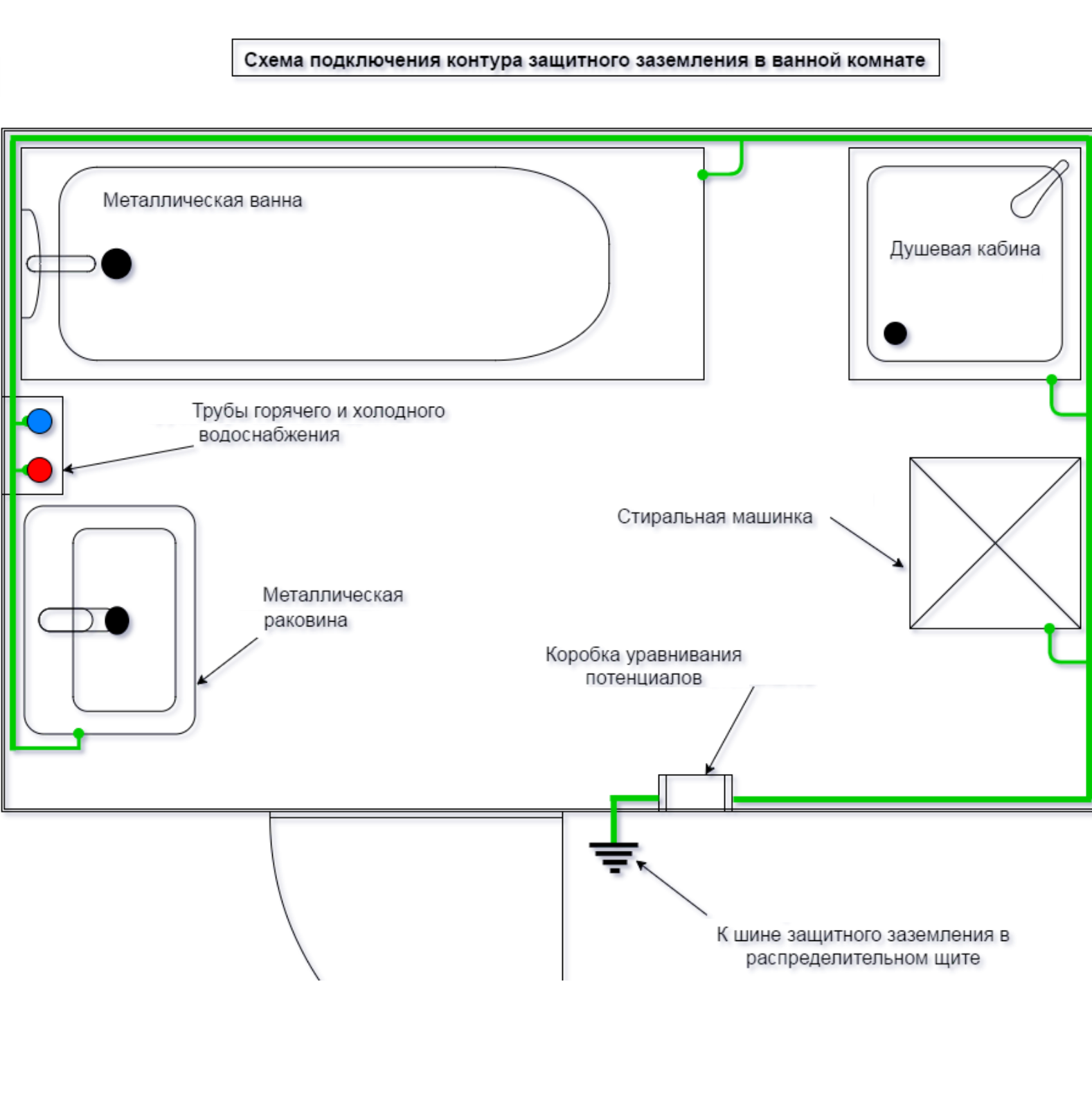 Схематично схему защитного заземления в ванной квартире можно представить следующим образом.