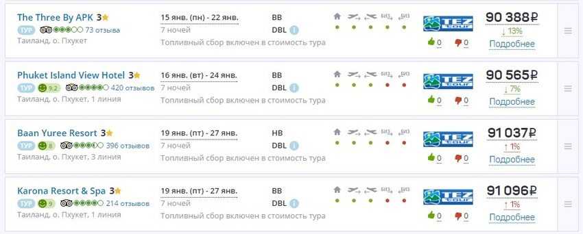 На Пхукете есть Международный аэропорт, сюда ежедневно прилетают чартерные рейсы из Москвы. Найти подходящий пакетный тур легко. Недельный отдых в отеле 3* на двоих в сезон обойдется минимум в 80/100 тысяч рублей. Ниже представлены самые бюджетные варианты.